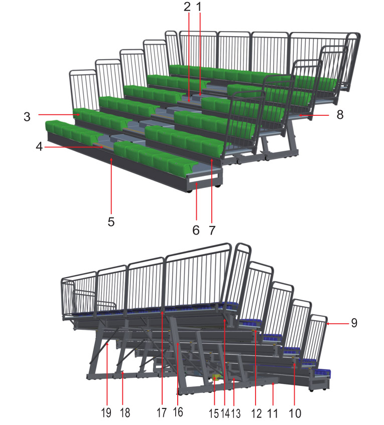 1.踏步 2.踏板 3.座椅 4.前沿板 5.前擋板 6.彈性首排支撐